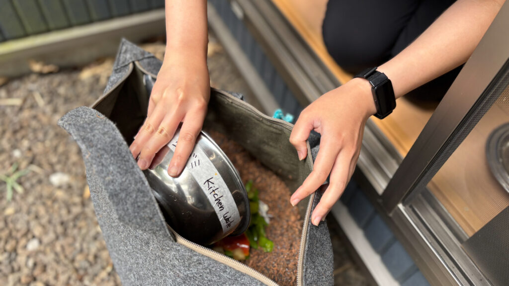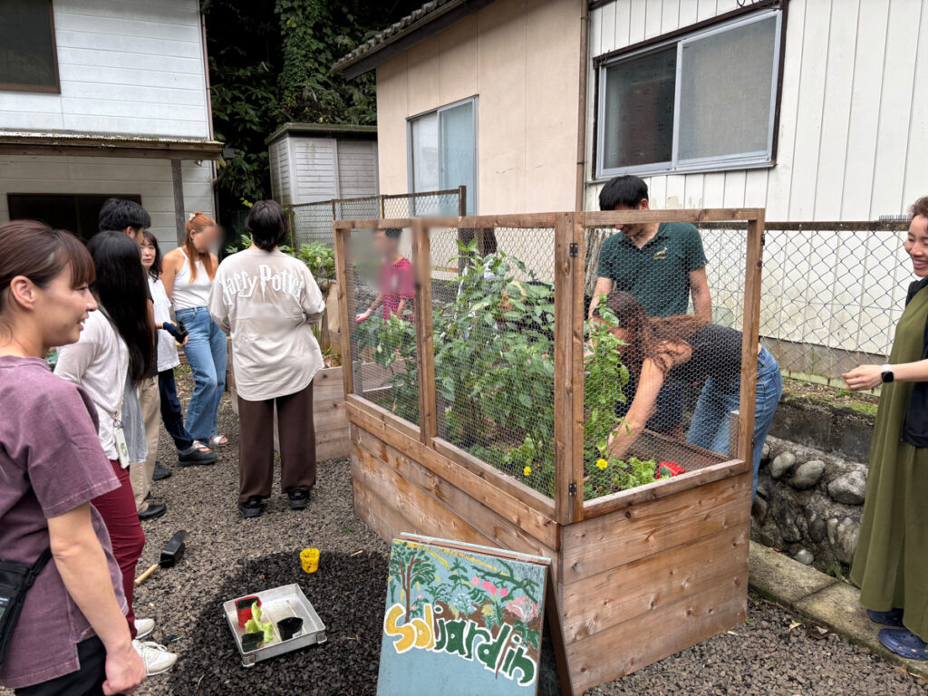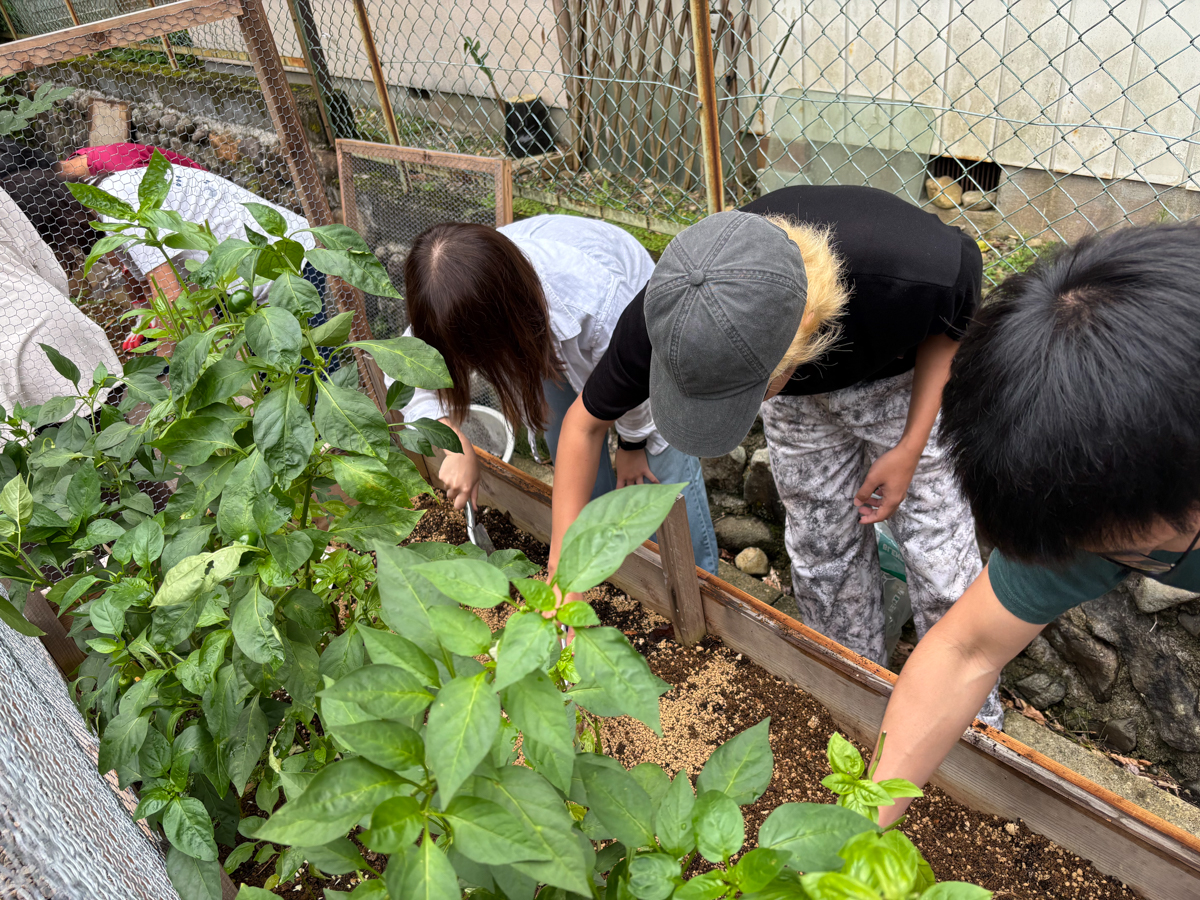 国際交流シェアハウス内にあるガーデンです。レイズドベッドで野菜やハーブを育てています。育てた野菜は住民同士の食事会や日々の食事に。生ごみコンポストにも取り組んでいます。